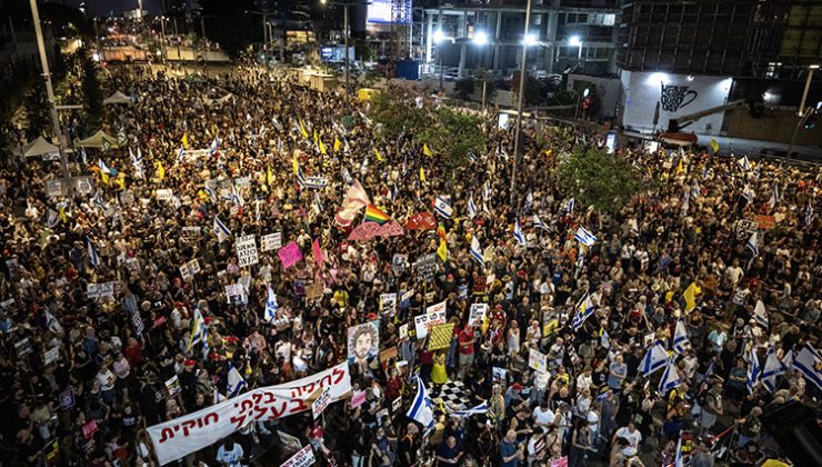 İsrailliler, Gazze Şeridi’nde ateşkes ve esir takasına yanaşmamakla suçladıkları Binyamin Netanyahu liderliğindeki hükümetten, kapsamlı bir anlaşma talebiyle İran’a saldırılar sonrası ilk kez Tel Aviv’de protesto düzenledi.